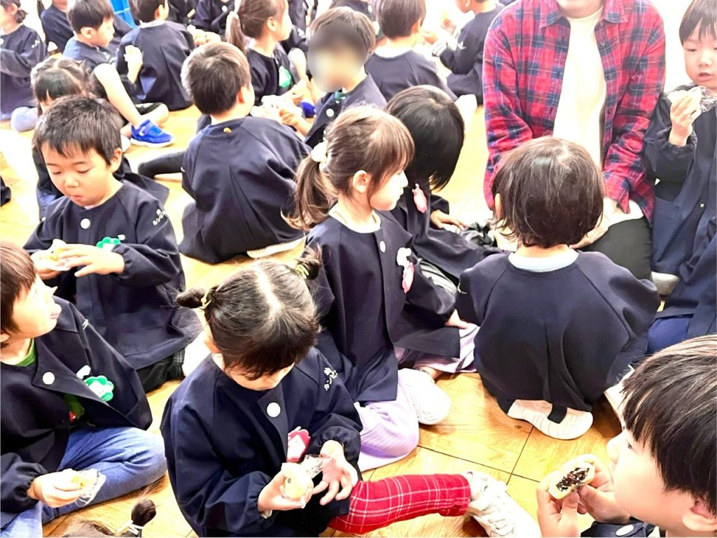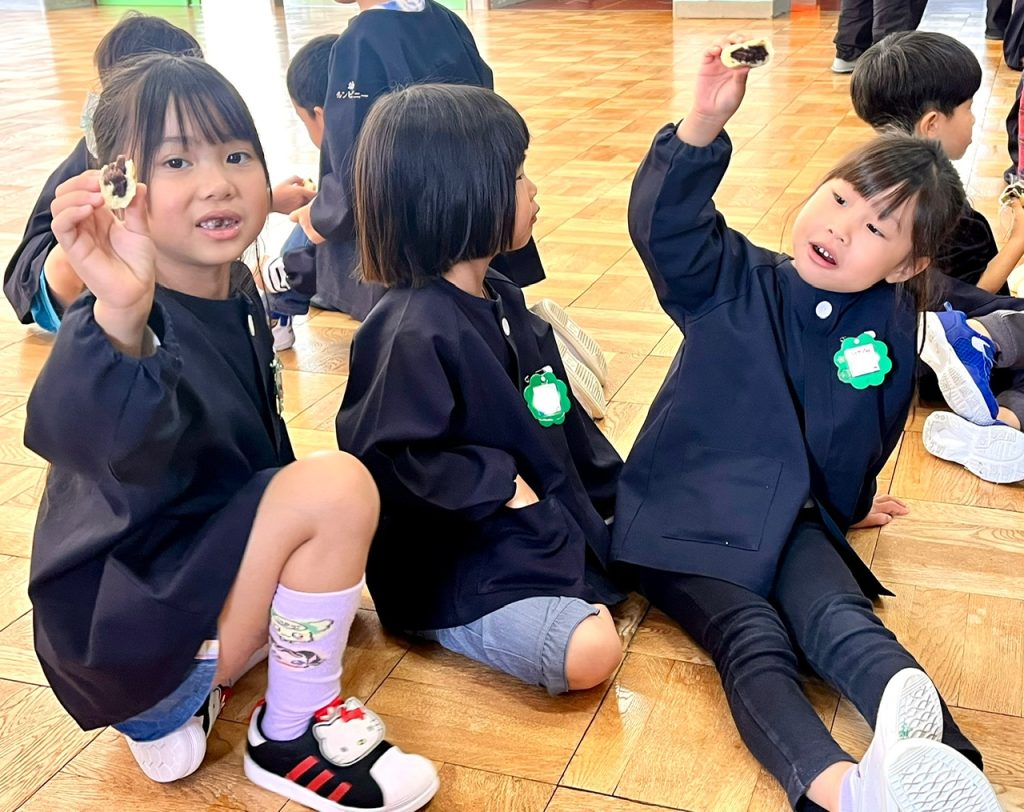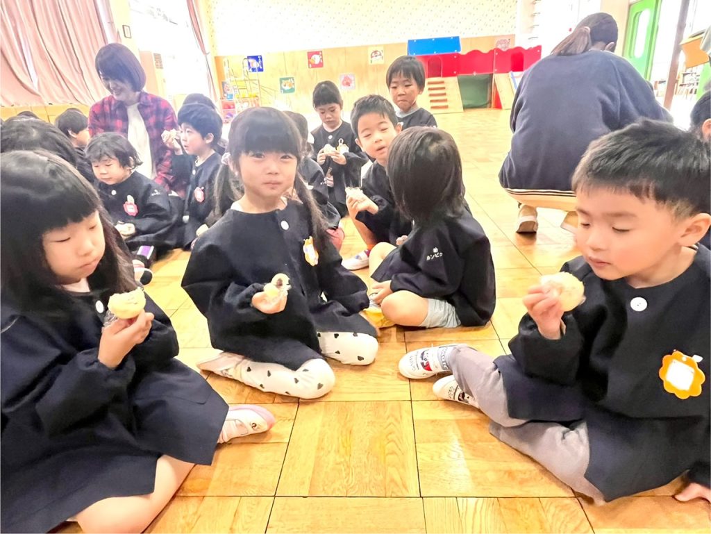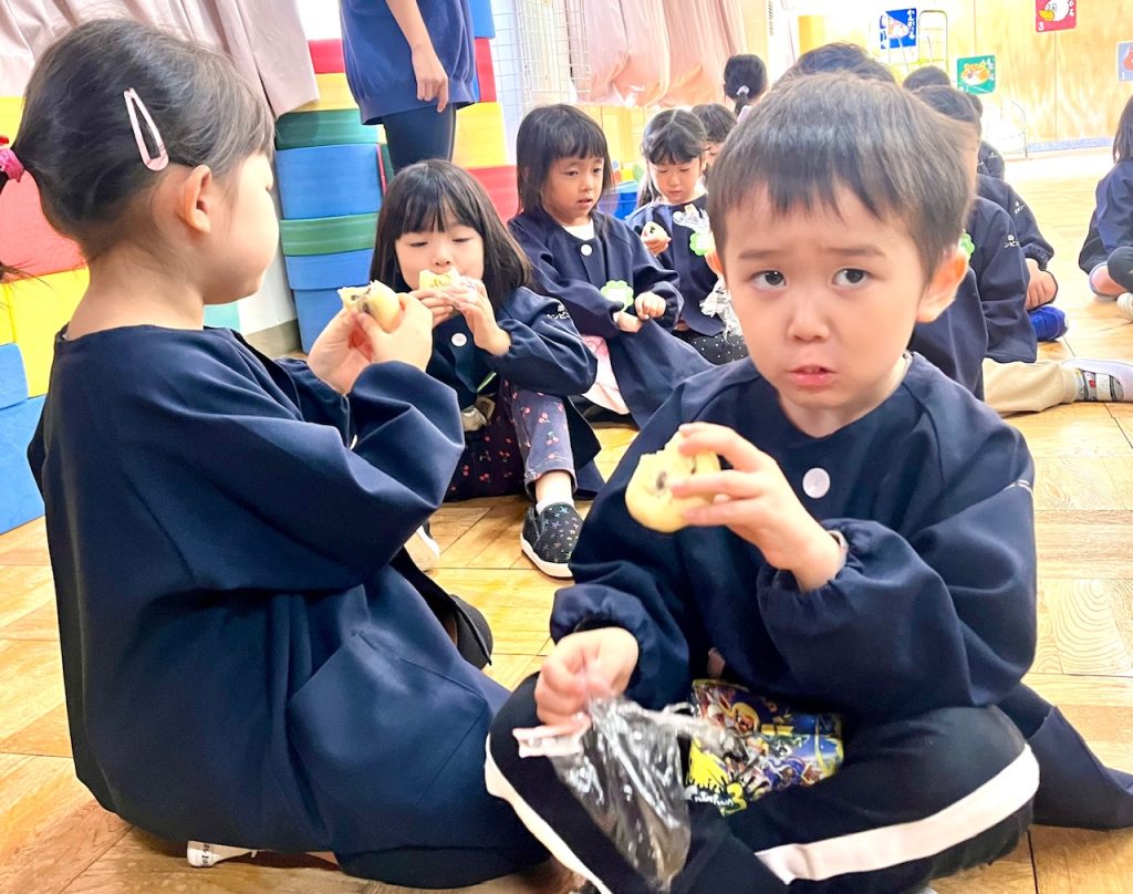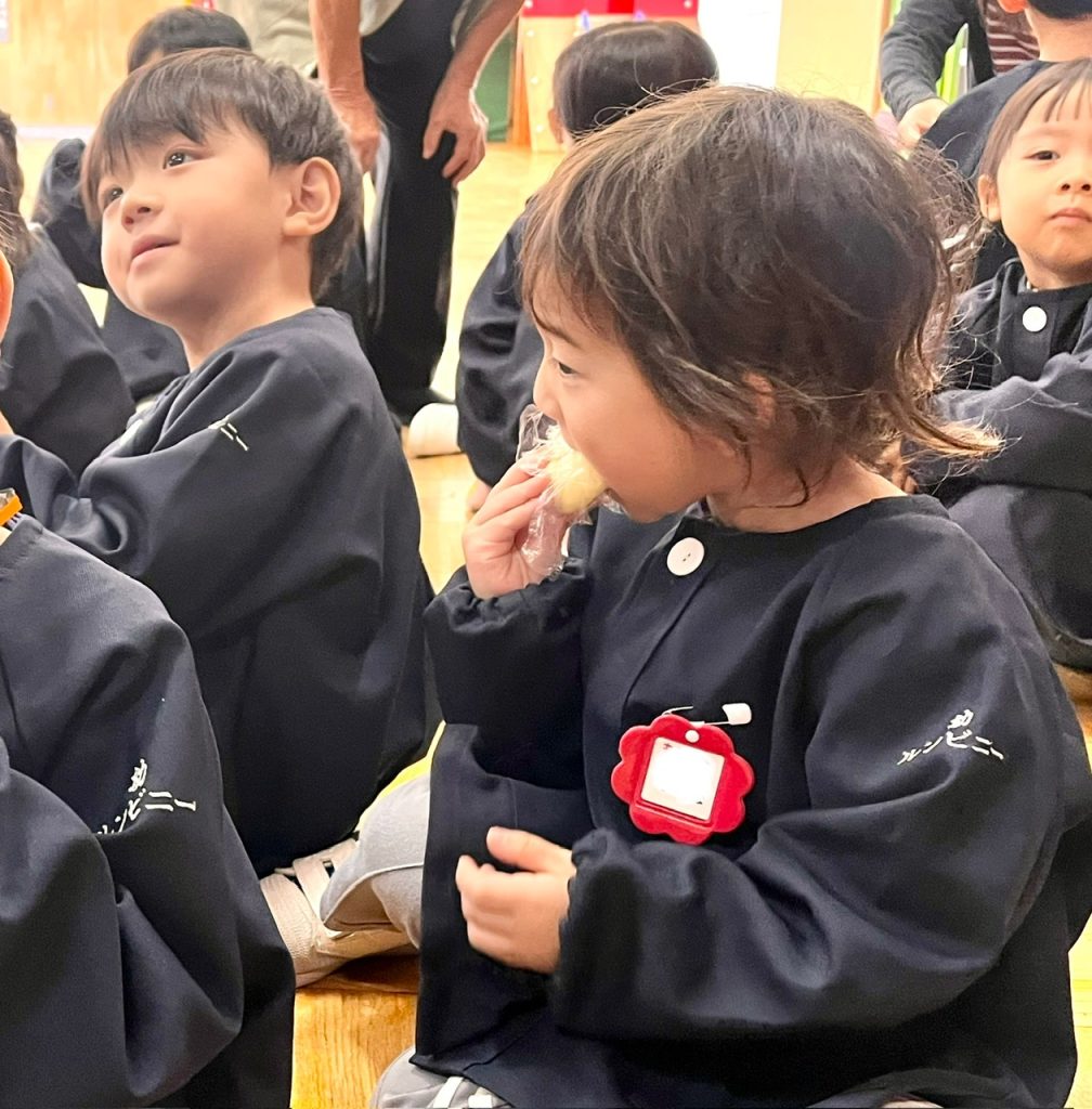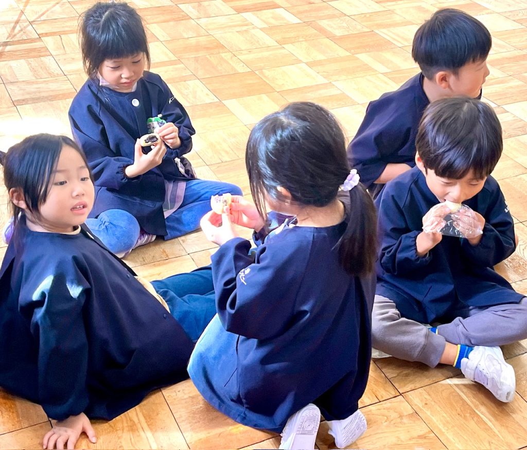 うさぎの焼印のついたお月見饅頭を皆で食べて、談笑する子ども達😃
