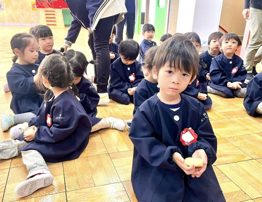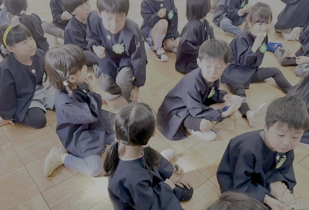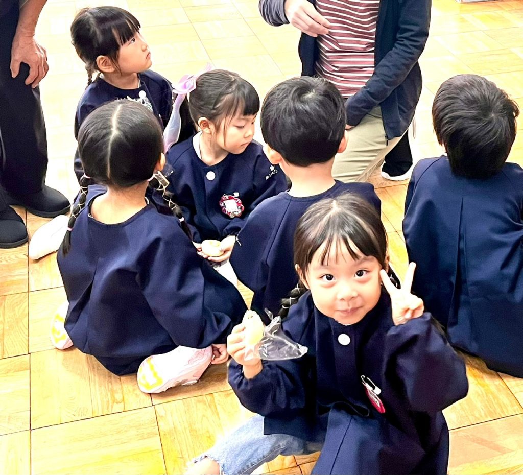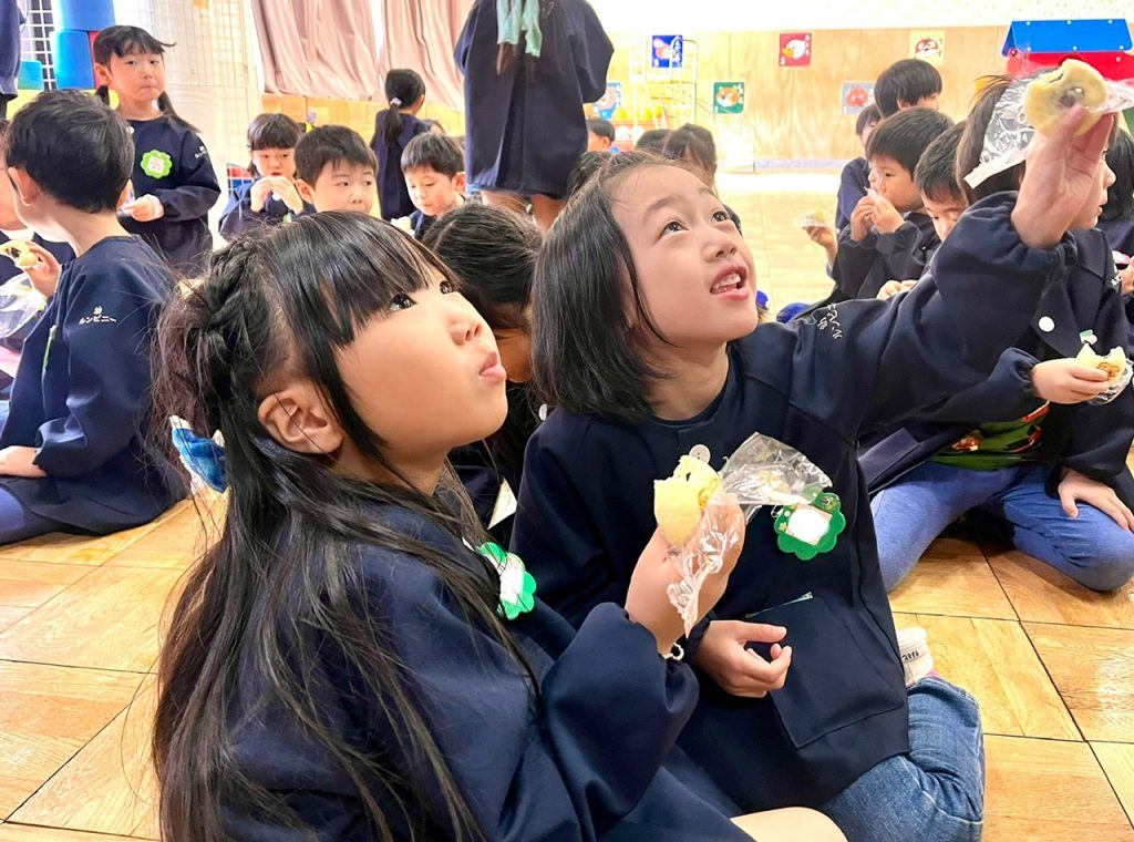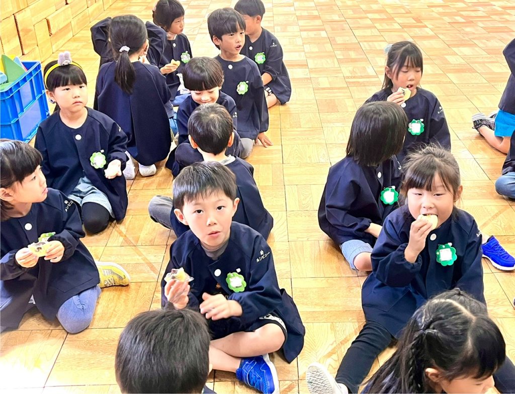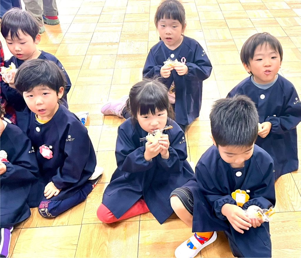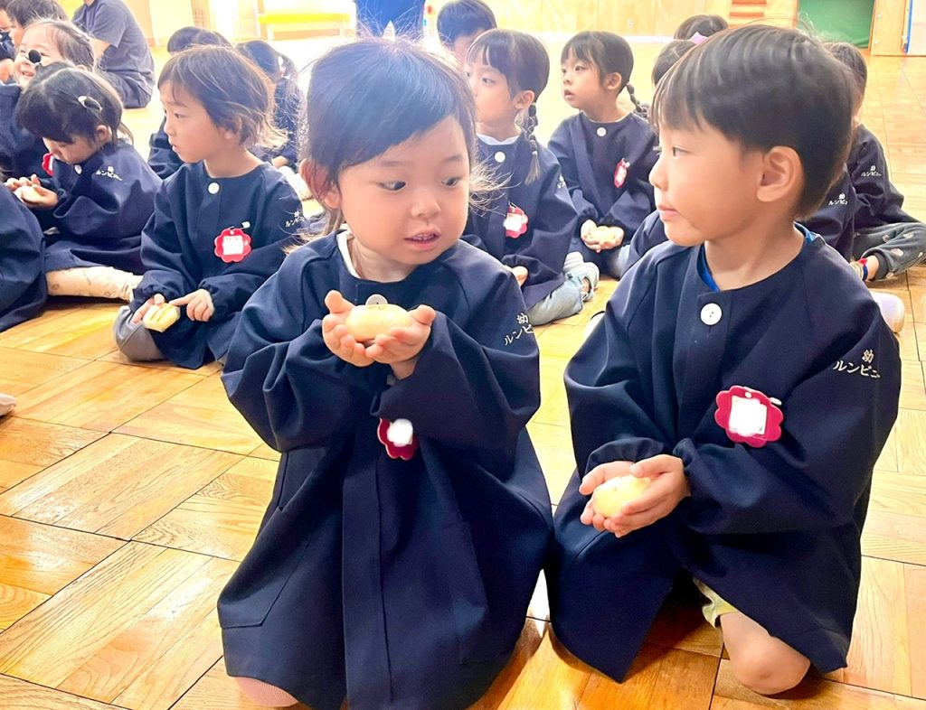 うさぎの焼印のついたお月見饅頭を皆で食べて、談笑する子ども達😃