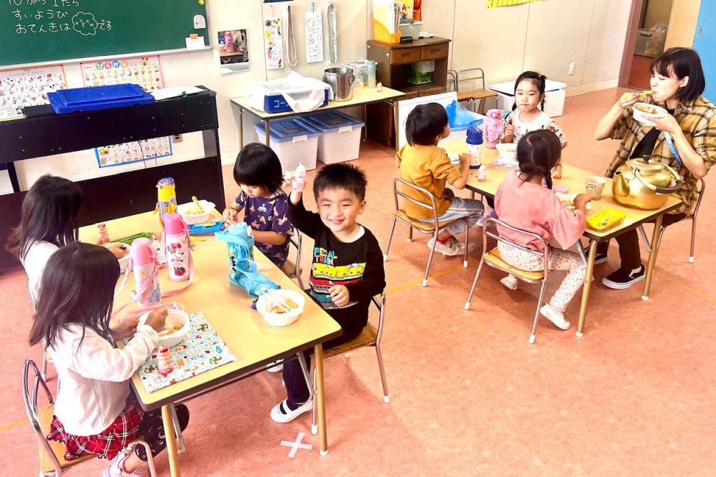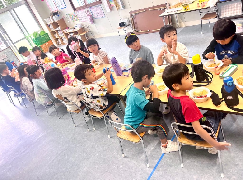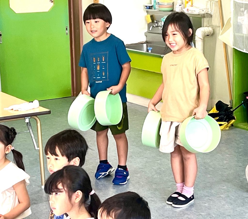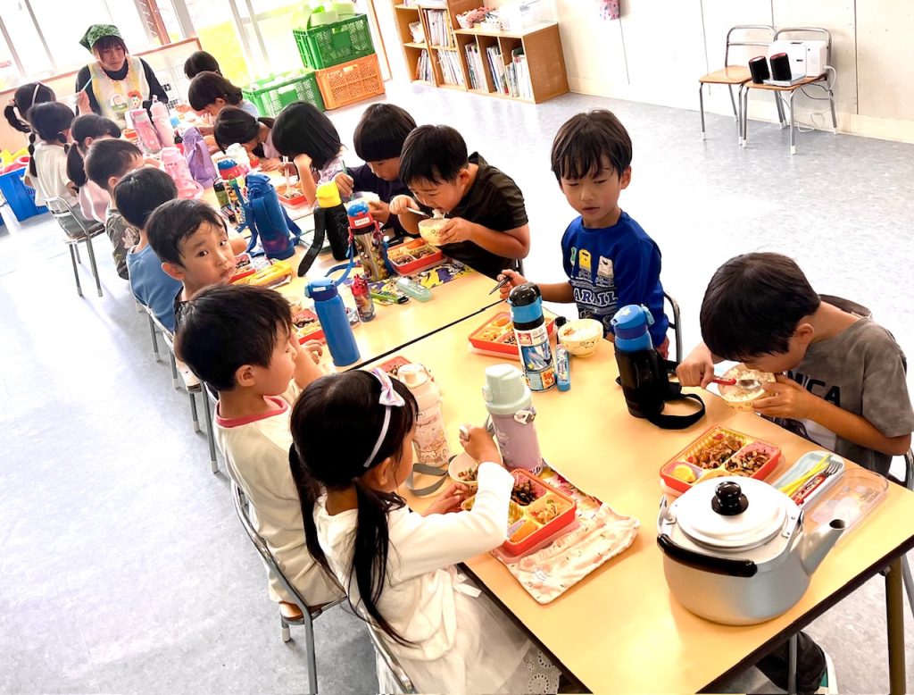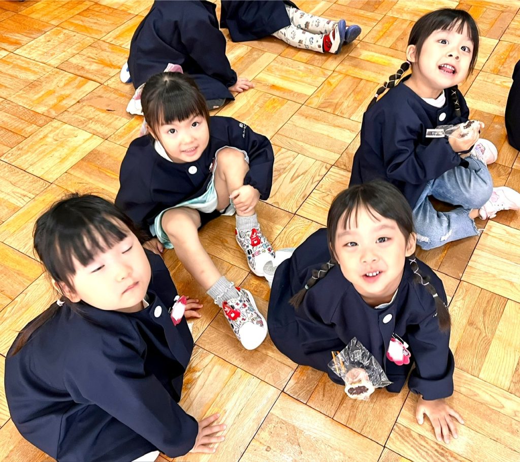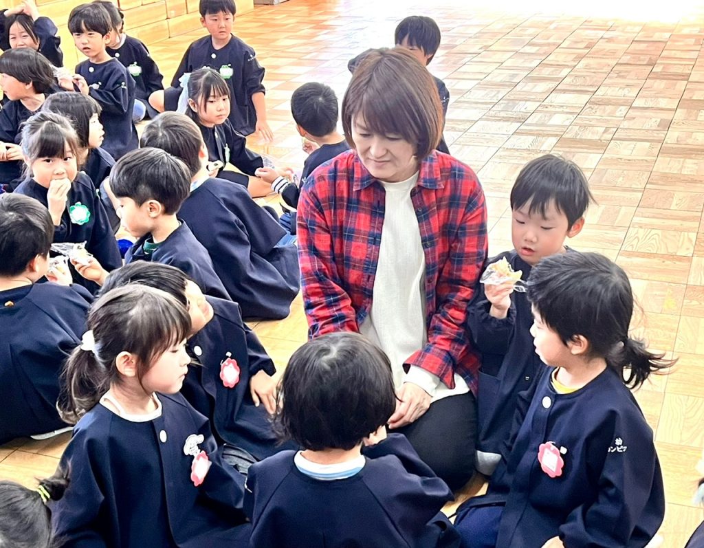 うさぎの焼印のついたお月見饅頭を皆で食べて、談笑する子ども達😃