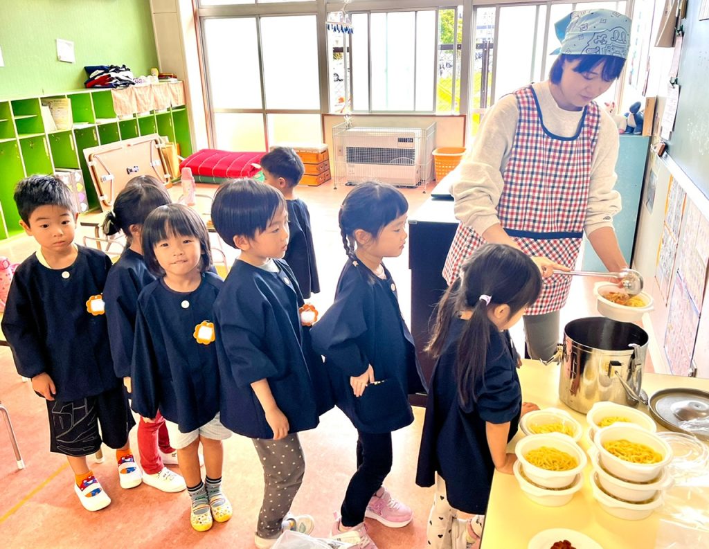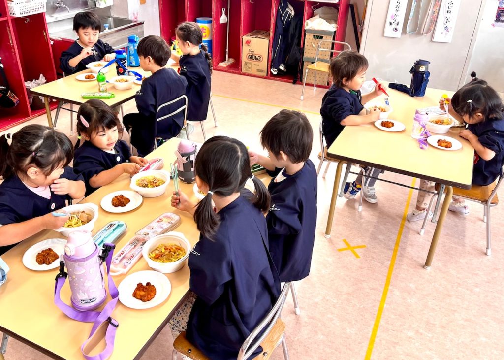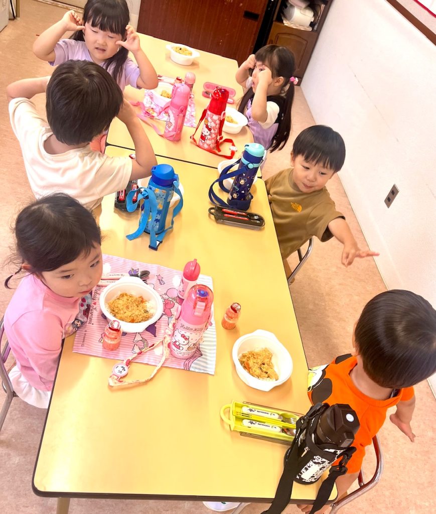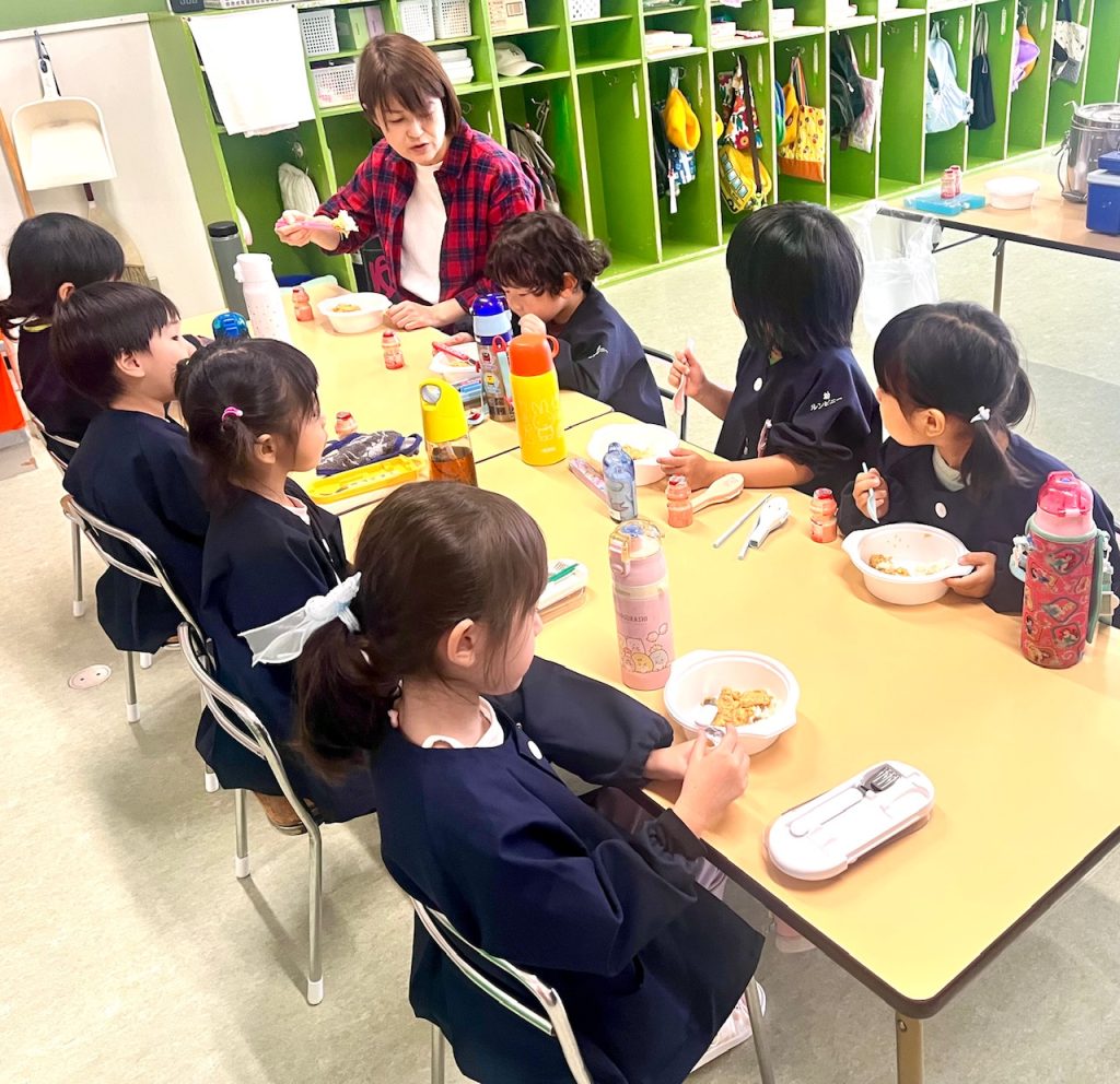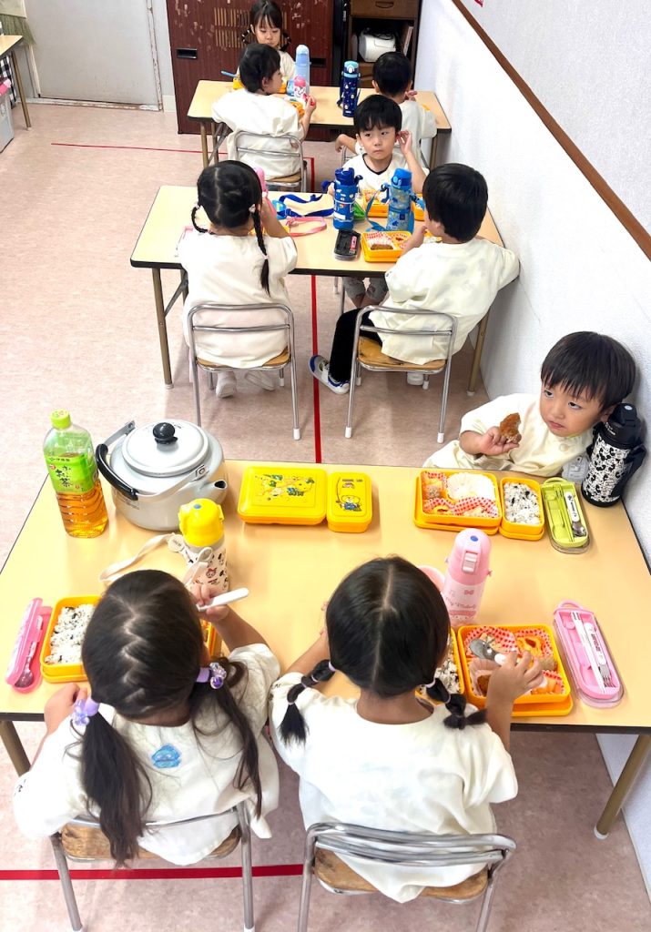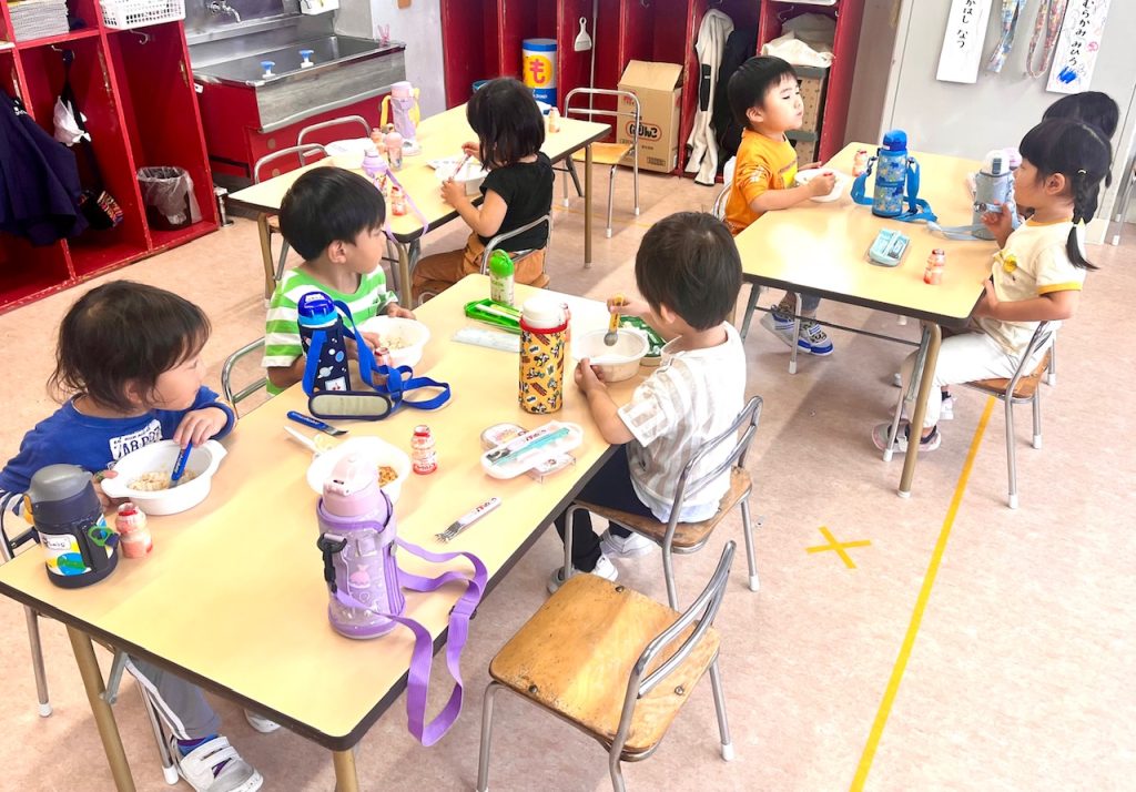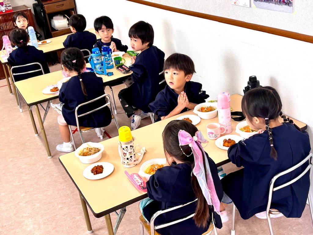 うさぎの焼印のついたお月見饅頭を皆で食べて、談笑する子ども達😃