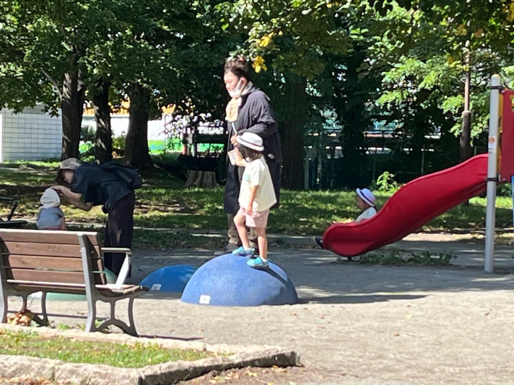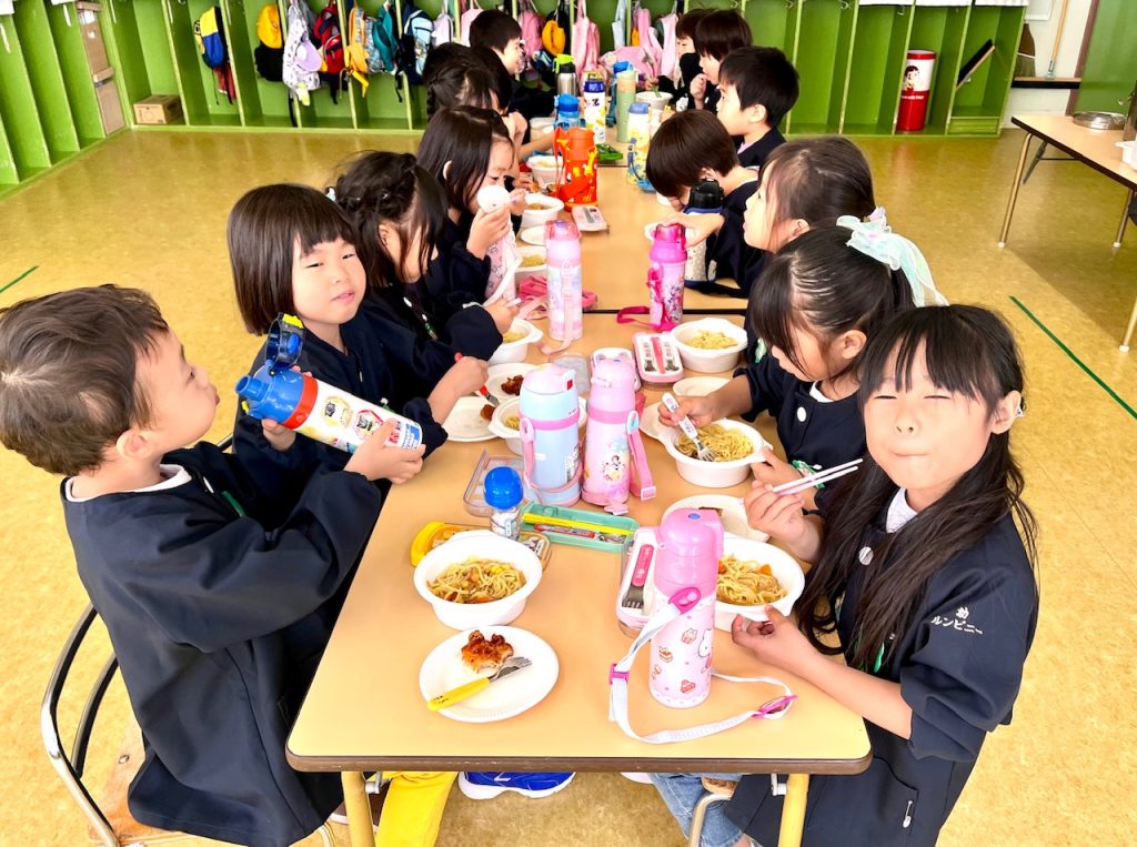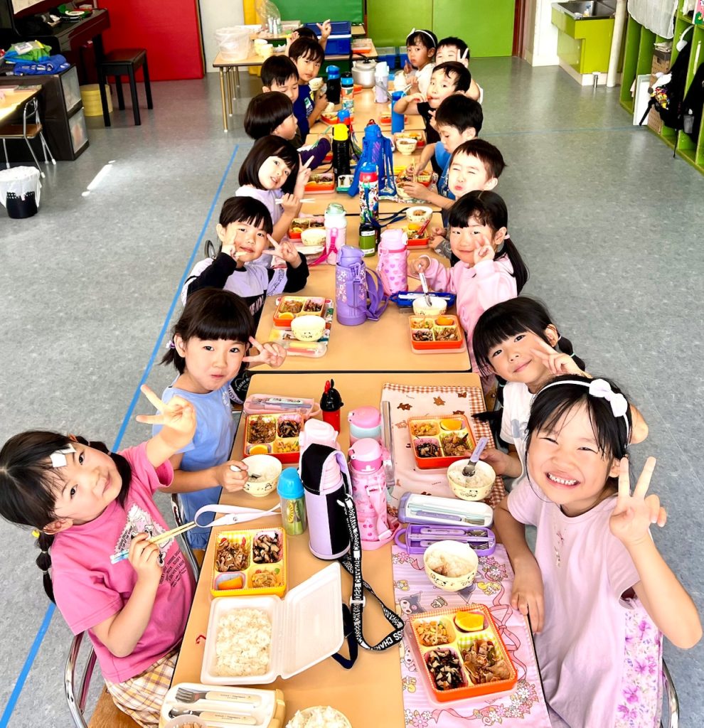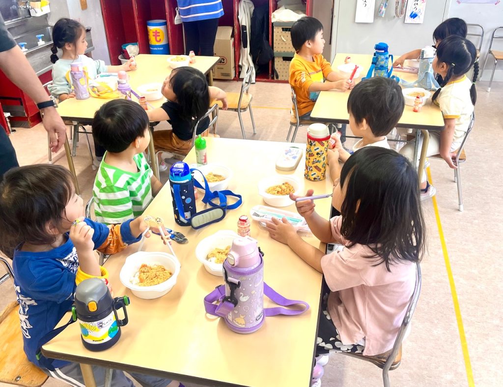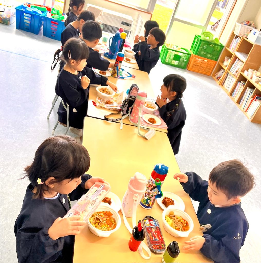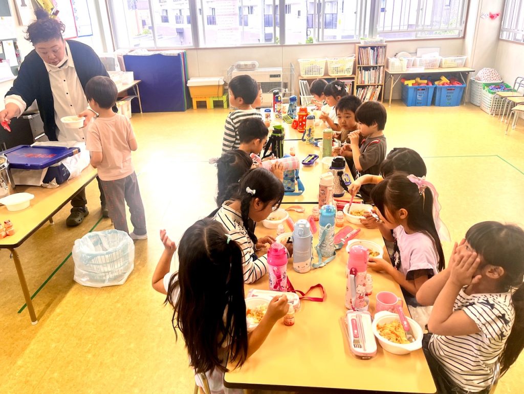 うさぎの焼印のついたお月見饅頭を皆で食べて、談笑する子ども達😃