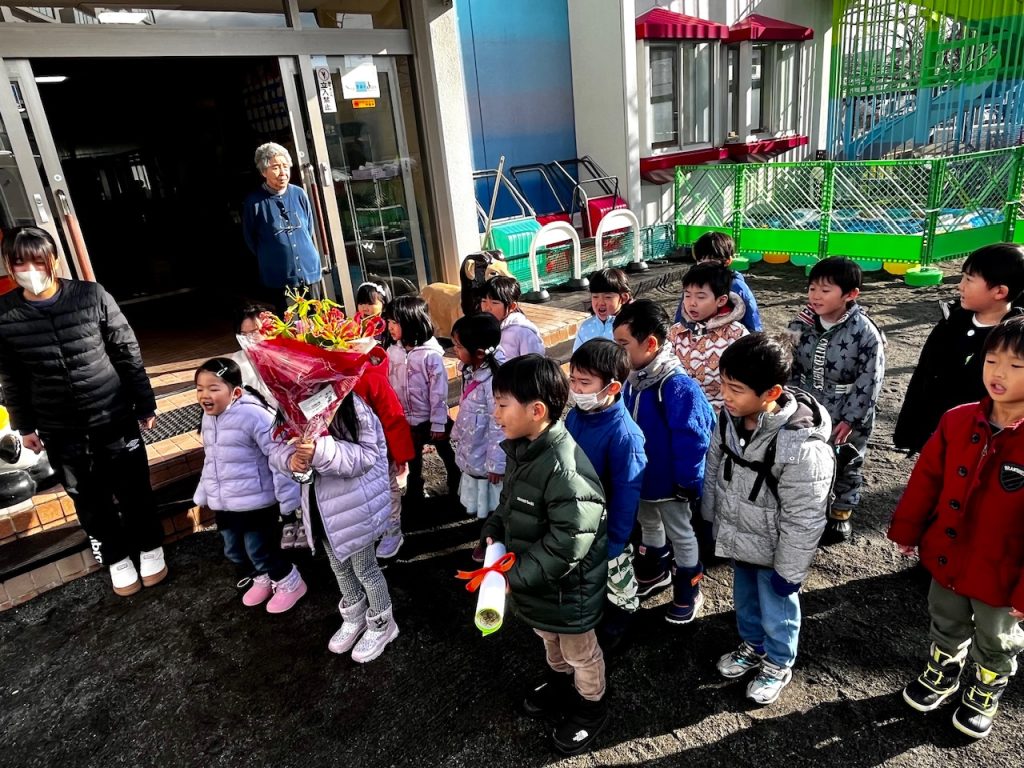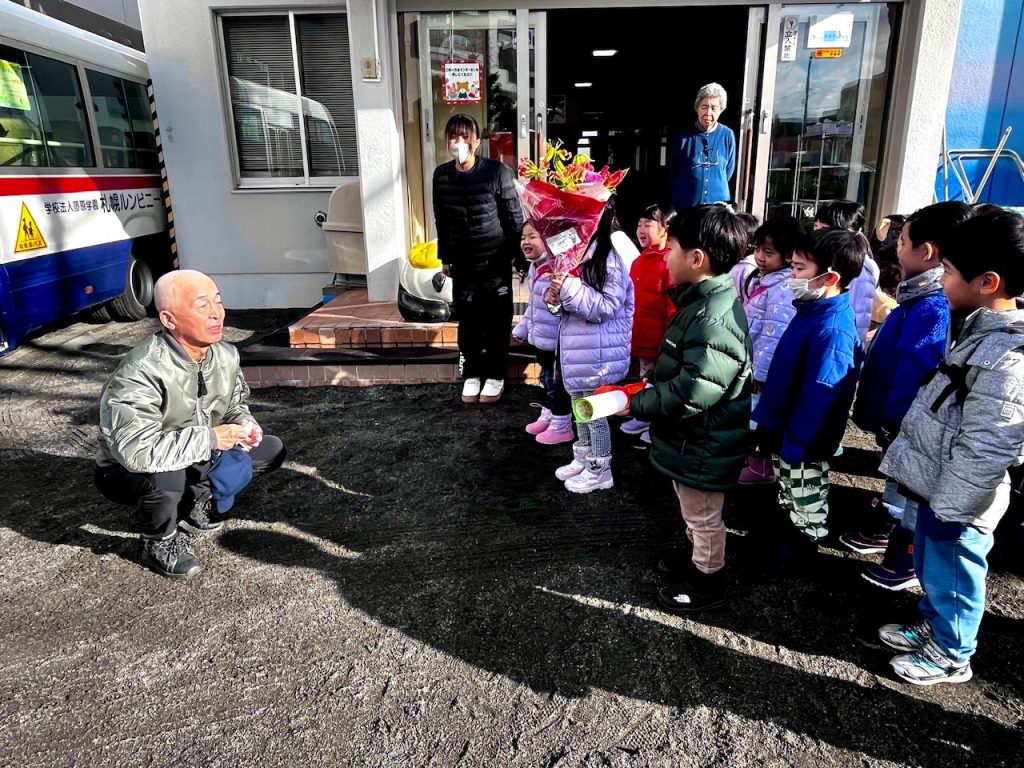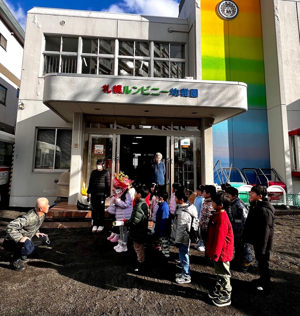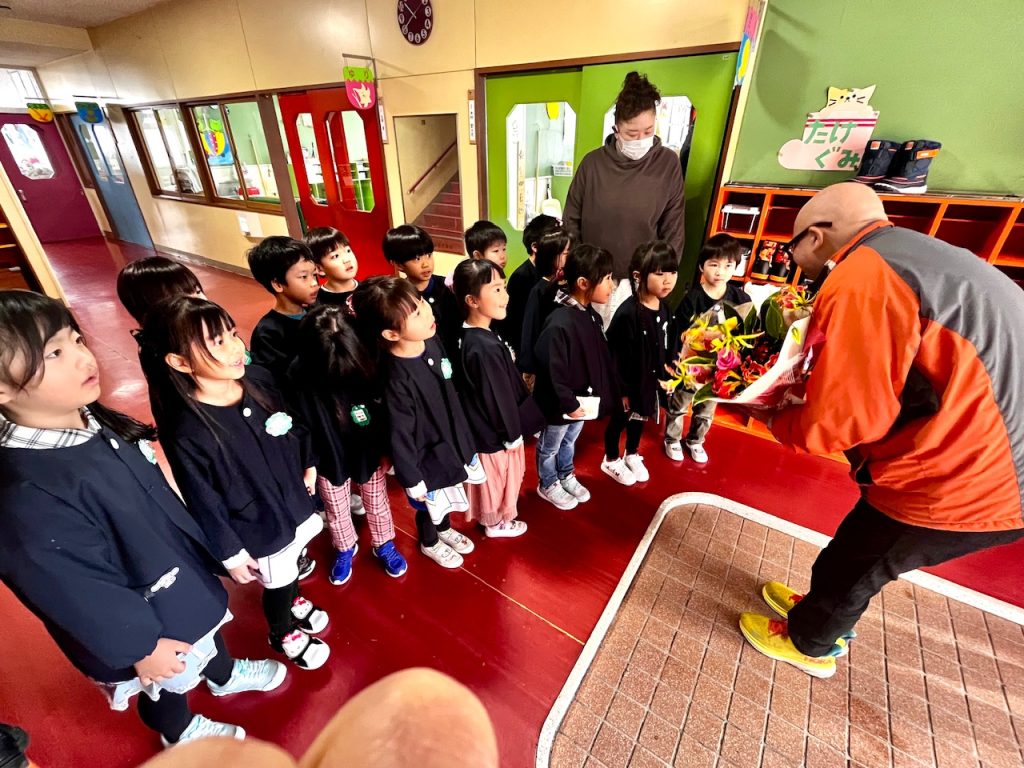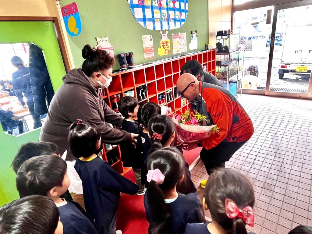 幼稚園の園児を代表して「きくさん」と「たけさん」がいつもお世話になっているバスの運転手さん🚌とコープさっぽろさん🍽️に花束と寄せ書きをプレゼント❗️❗️