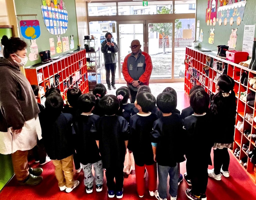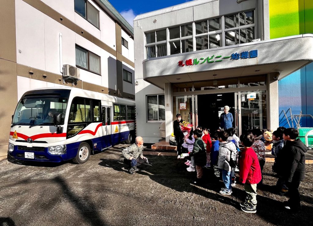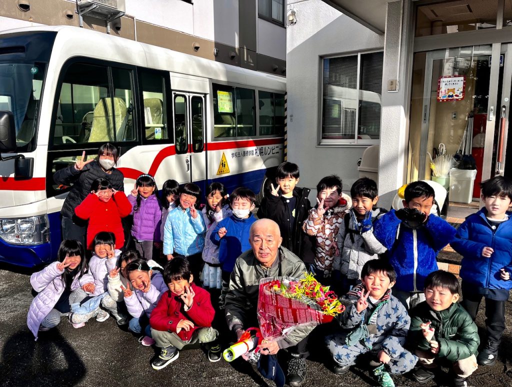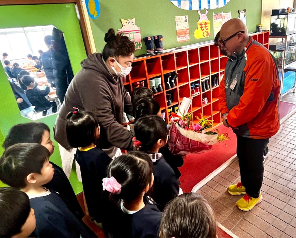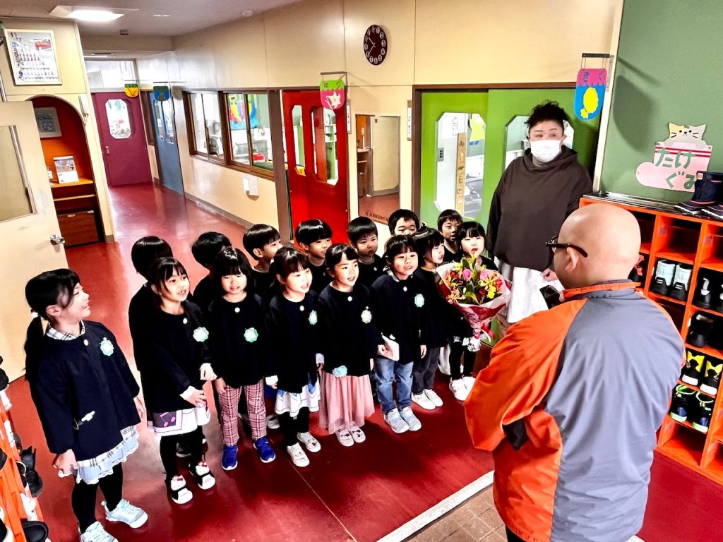 幼稚園の園児を代表して「きくさん」と「たけさん」がいつもお世話になっているバスの運転手さん🚌とコープさっぽろさん🍽️に花束と寄せ書きをプレゼント❗️❗️