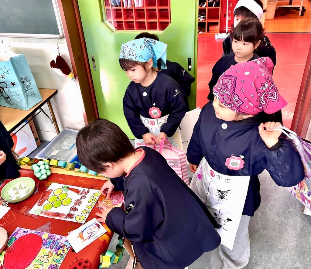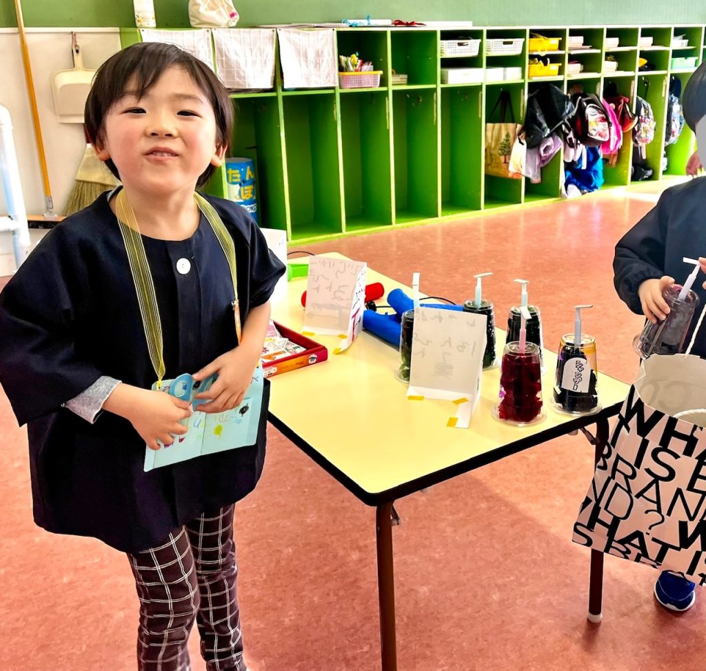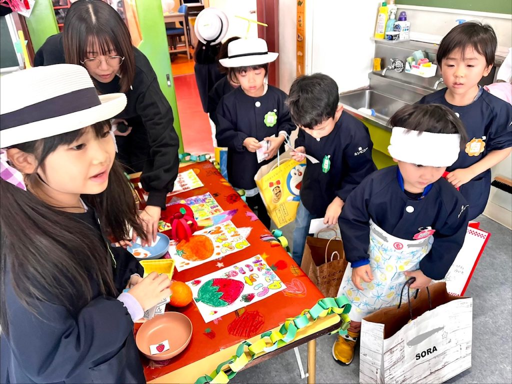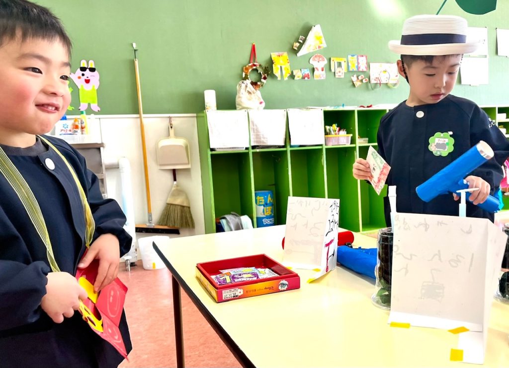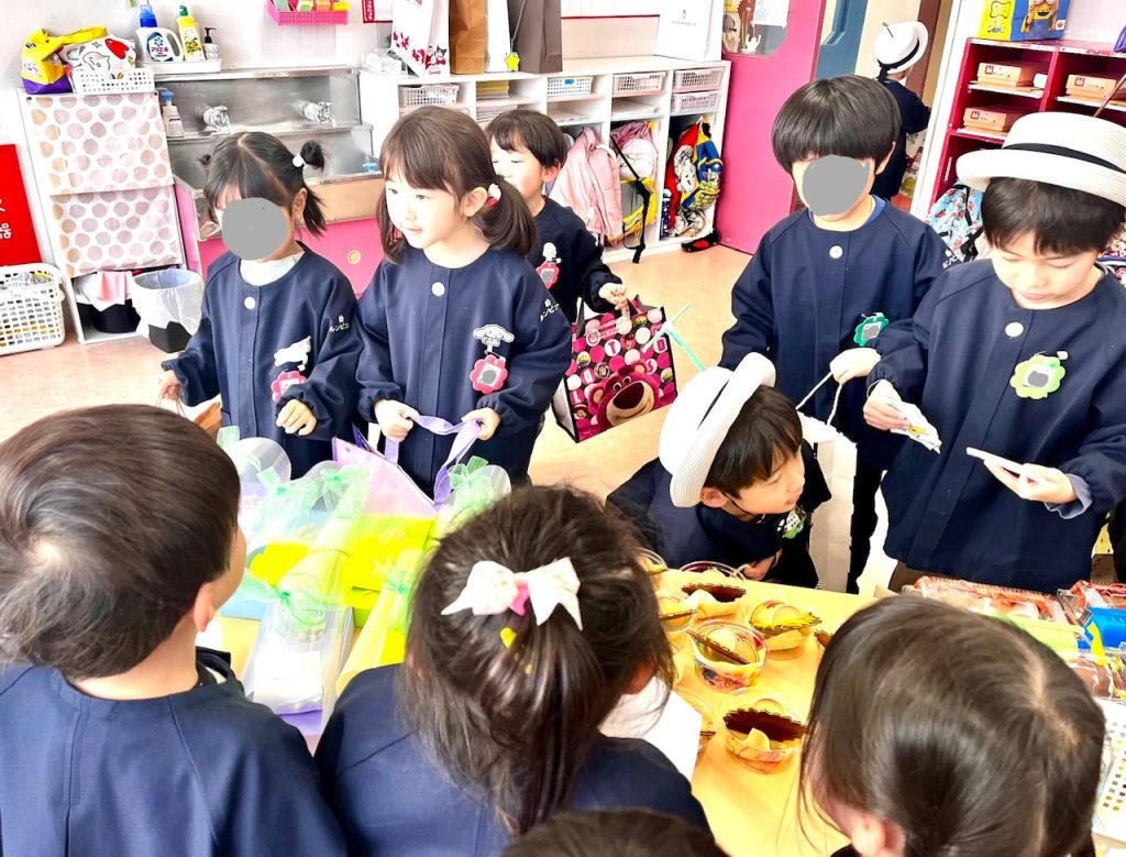 年中長さんからは「欲しい物買えたー❗️」の声がたくさん聞けたり、年少さんも初めてのお店屋さんごっこでしたが、大きな声で「いらっしゃいませ」していたり、欲しい物を買いにいったりと、とても上手にお買い物できていました❗️