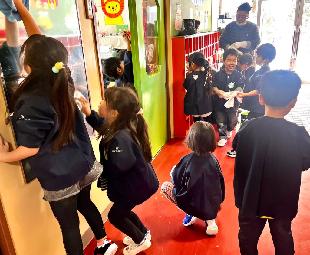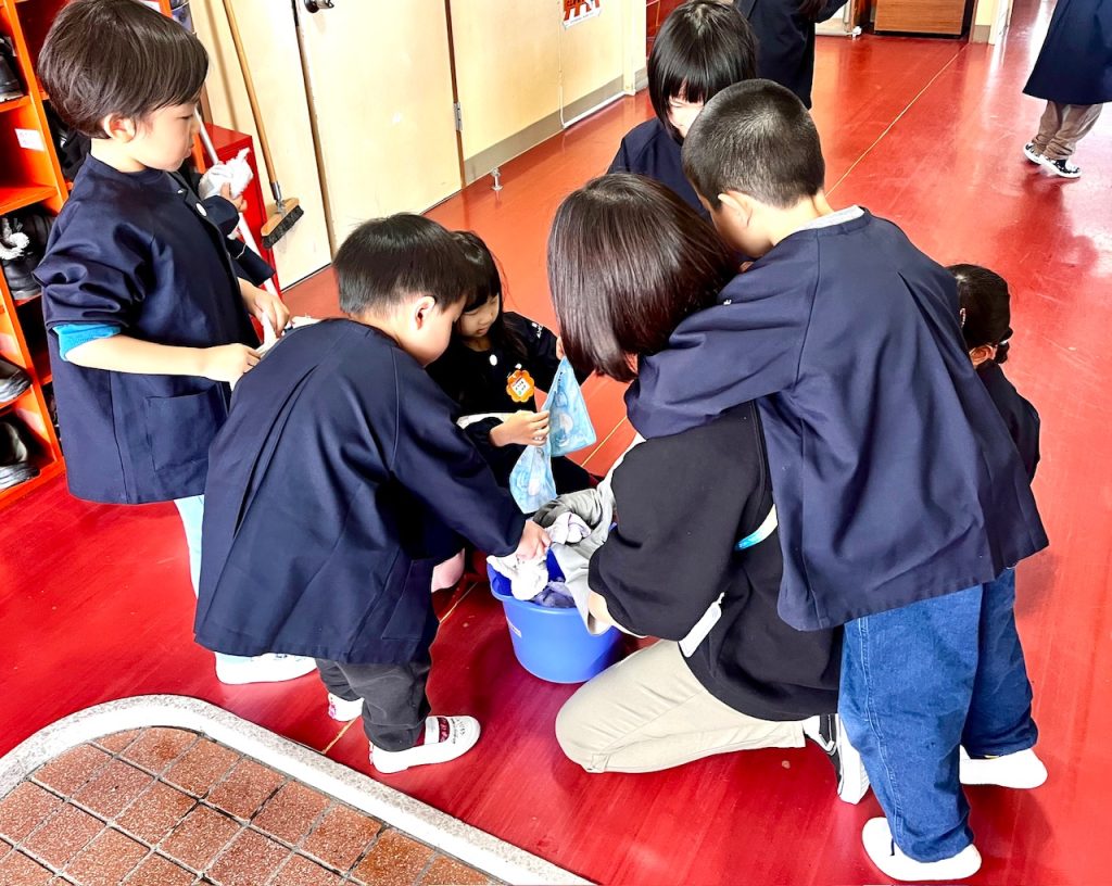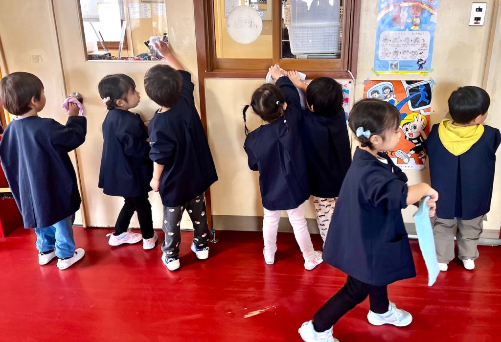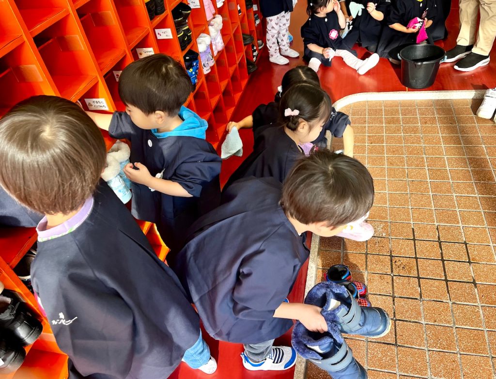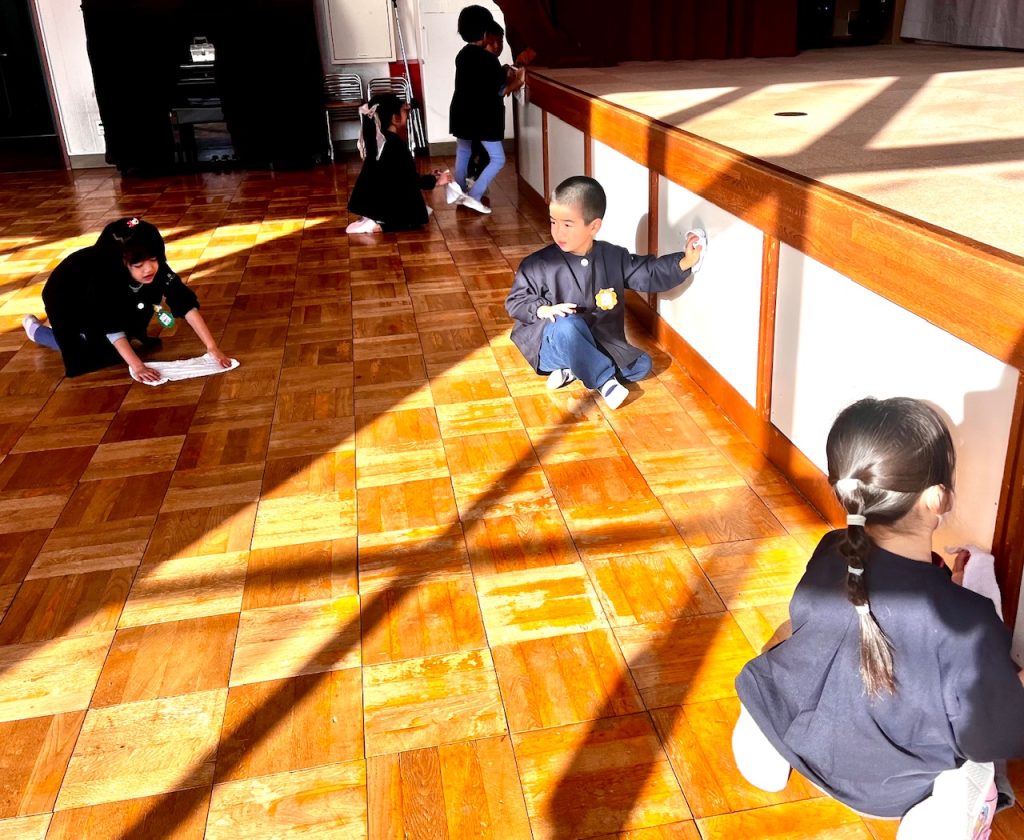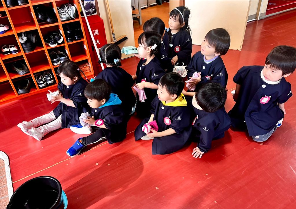 靴箱や廊下、お遊戯場まで全園児がピカピカにしてくれて、雑布が真っ黒に。
