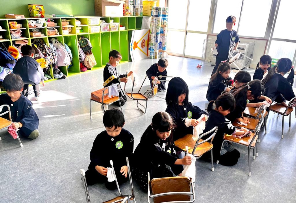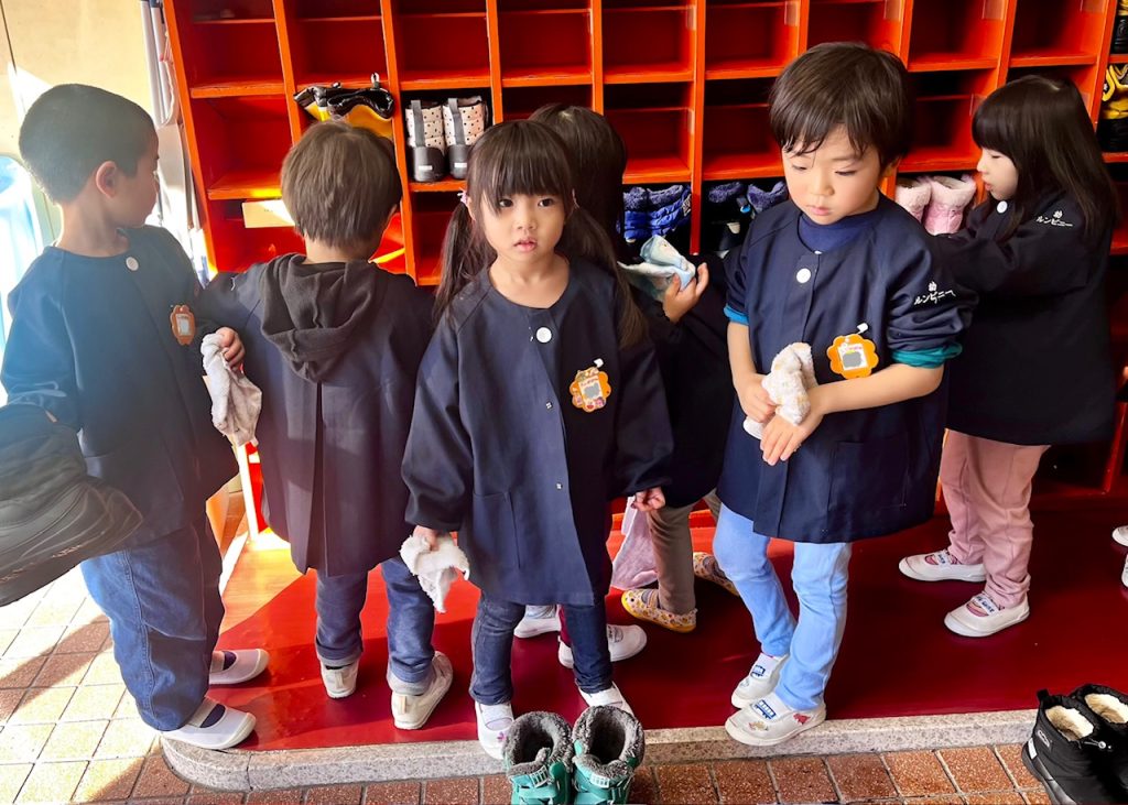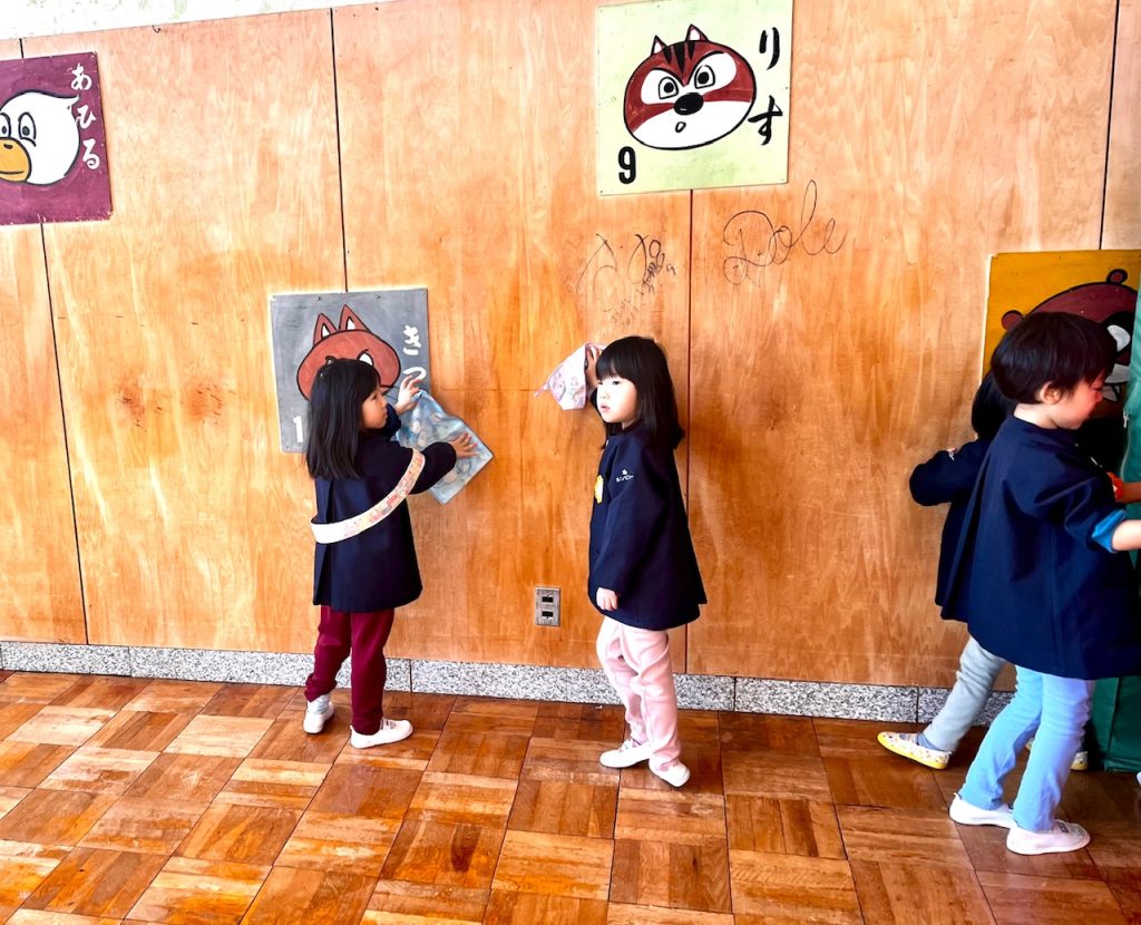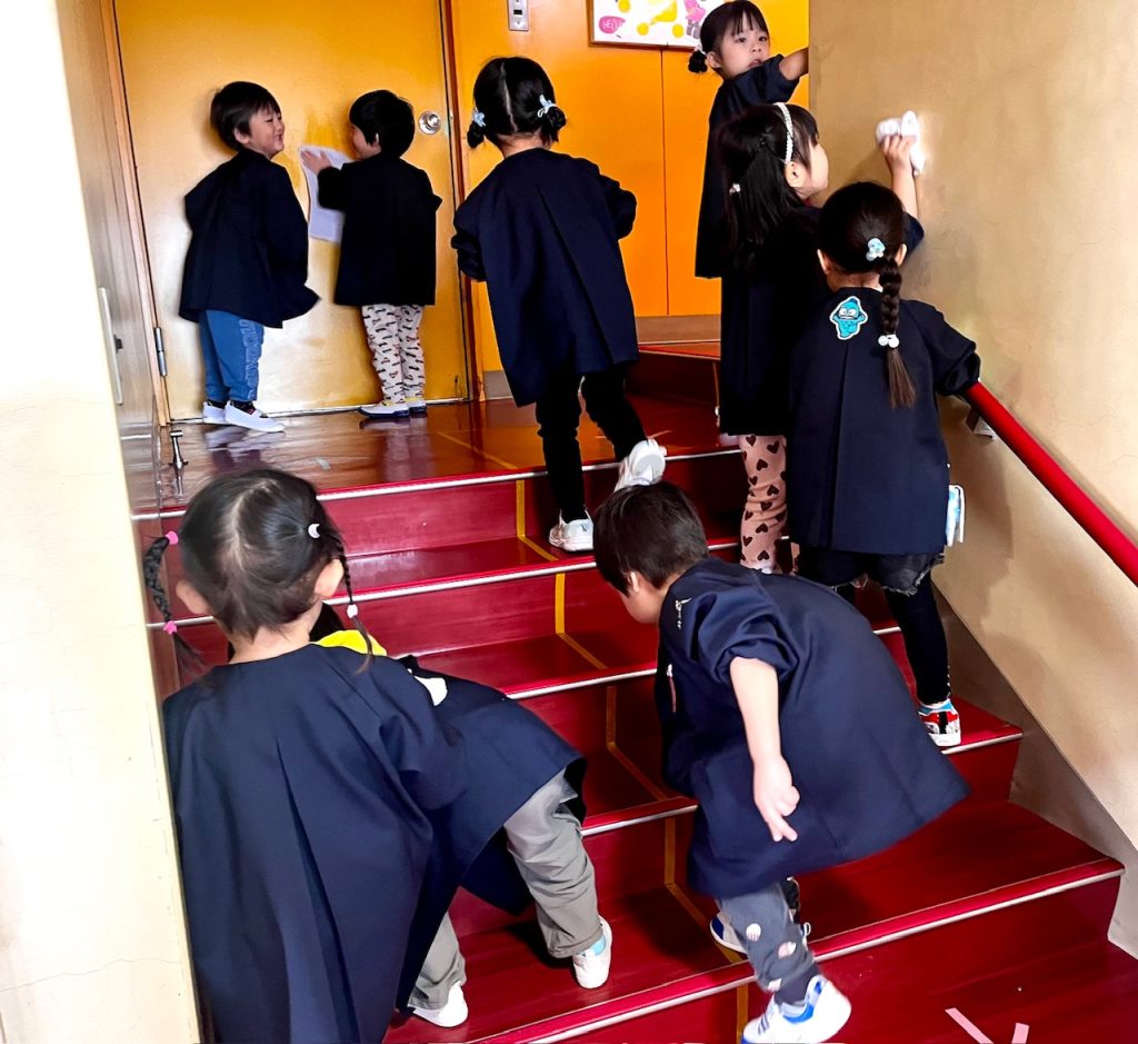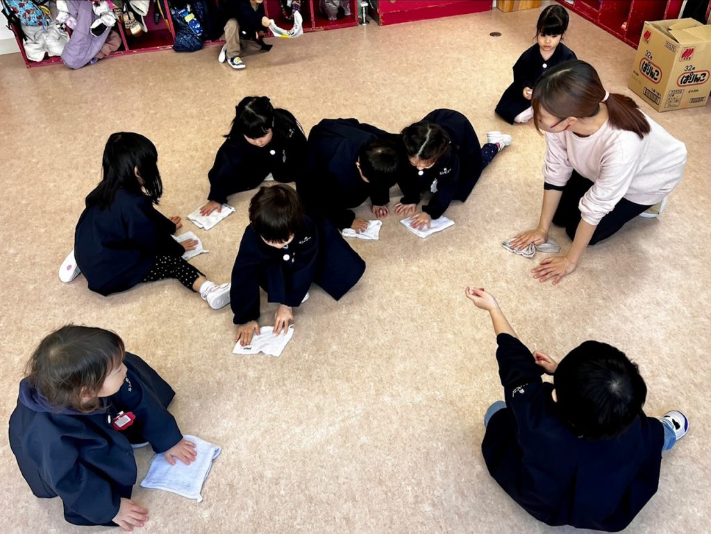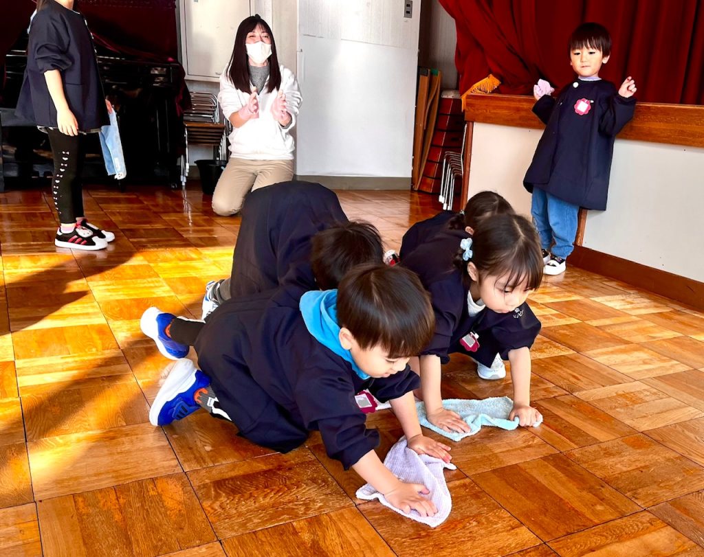 靴箱や廊下、お遊戯場まで全園児がピカピカにしてくれて、雑布が真っ黒に。