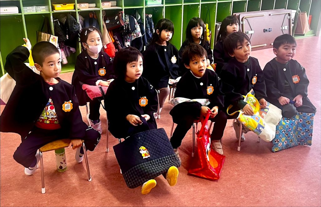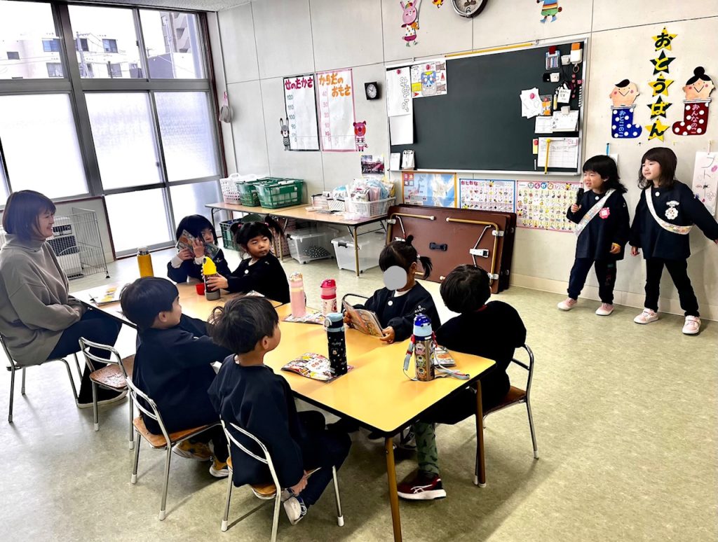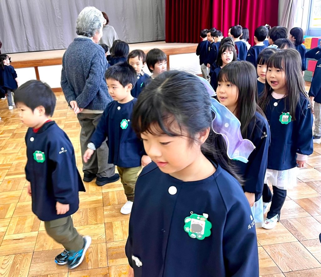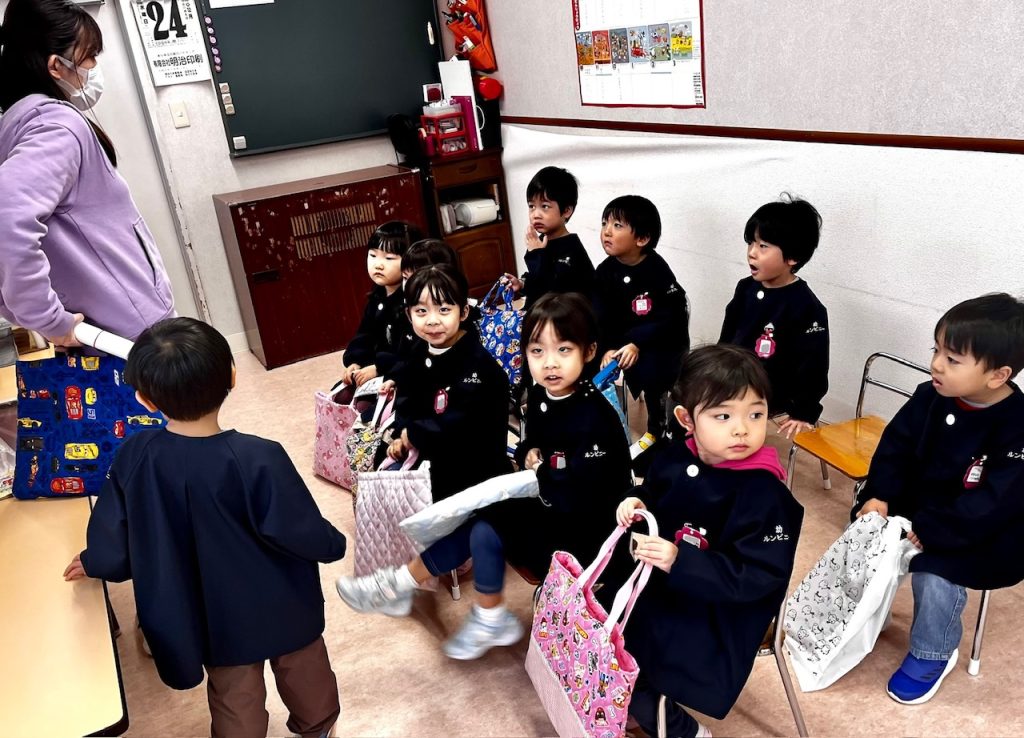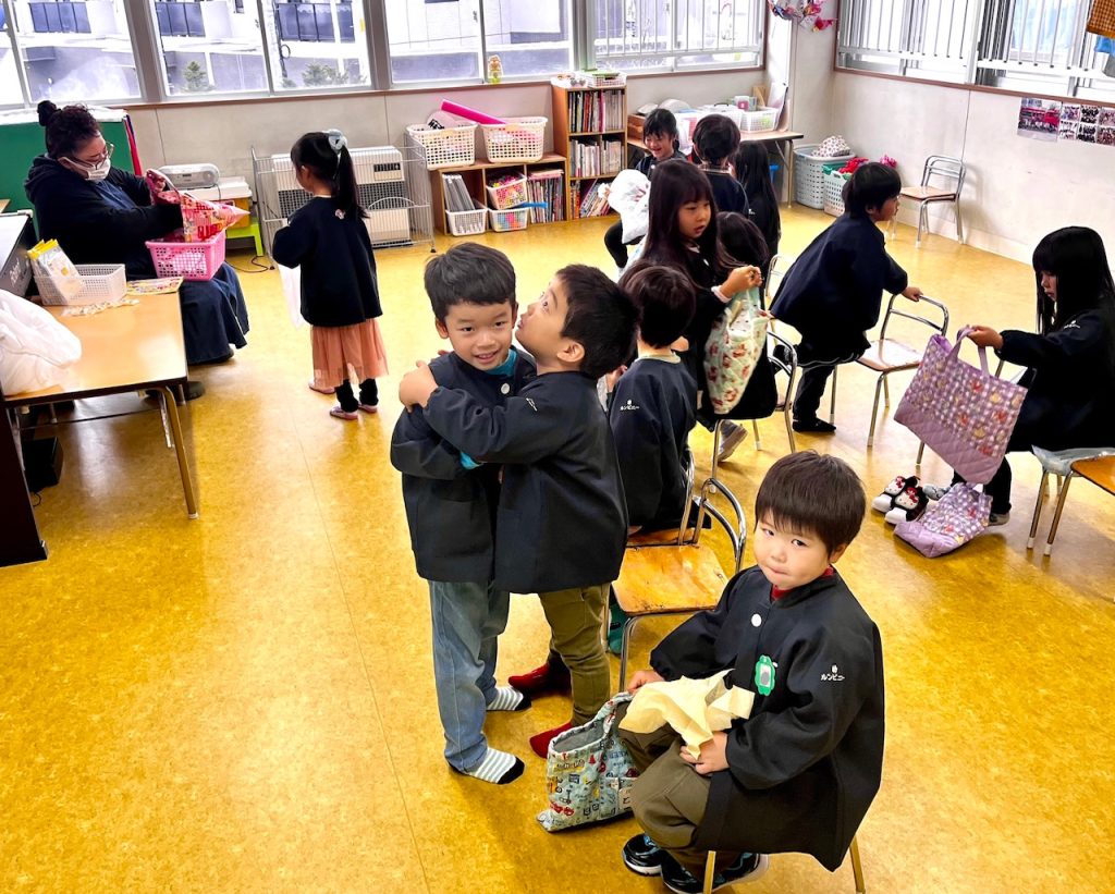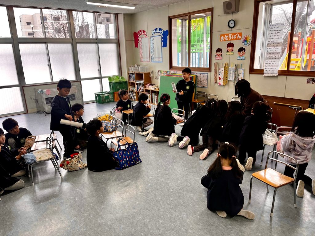 お遊戯場での終業式のあとは、お部屋で配布物を貰いました。